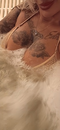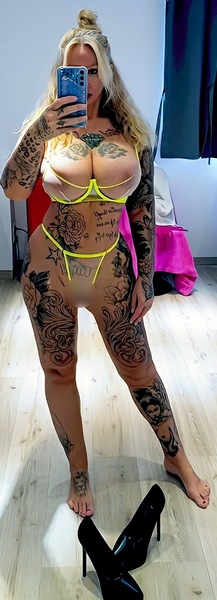 Stilvolle Tattoos schmücken meine Haut, meine langen blonden Locken rahmen ein Gesicht mit grünen Katzenaugen, die dich beim … ganz genau … tief fixieren.